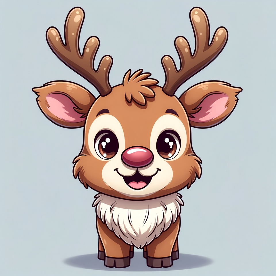 A cartoon deer stands with a smile. It has brown fur, big eyes, and antlers. The background is plain and light.
