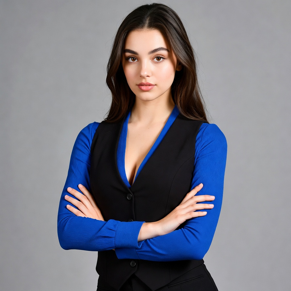 adult, arms crossed, black vest, blue blouse, business attire, confident, expression, fashion, feminine, formal wear, hairstyle, plain background, pose, professional, serious expression, simplicity, standing, studio, style, woman