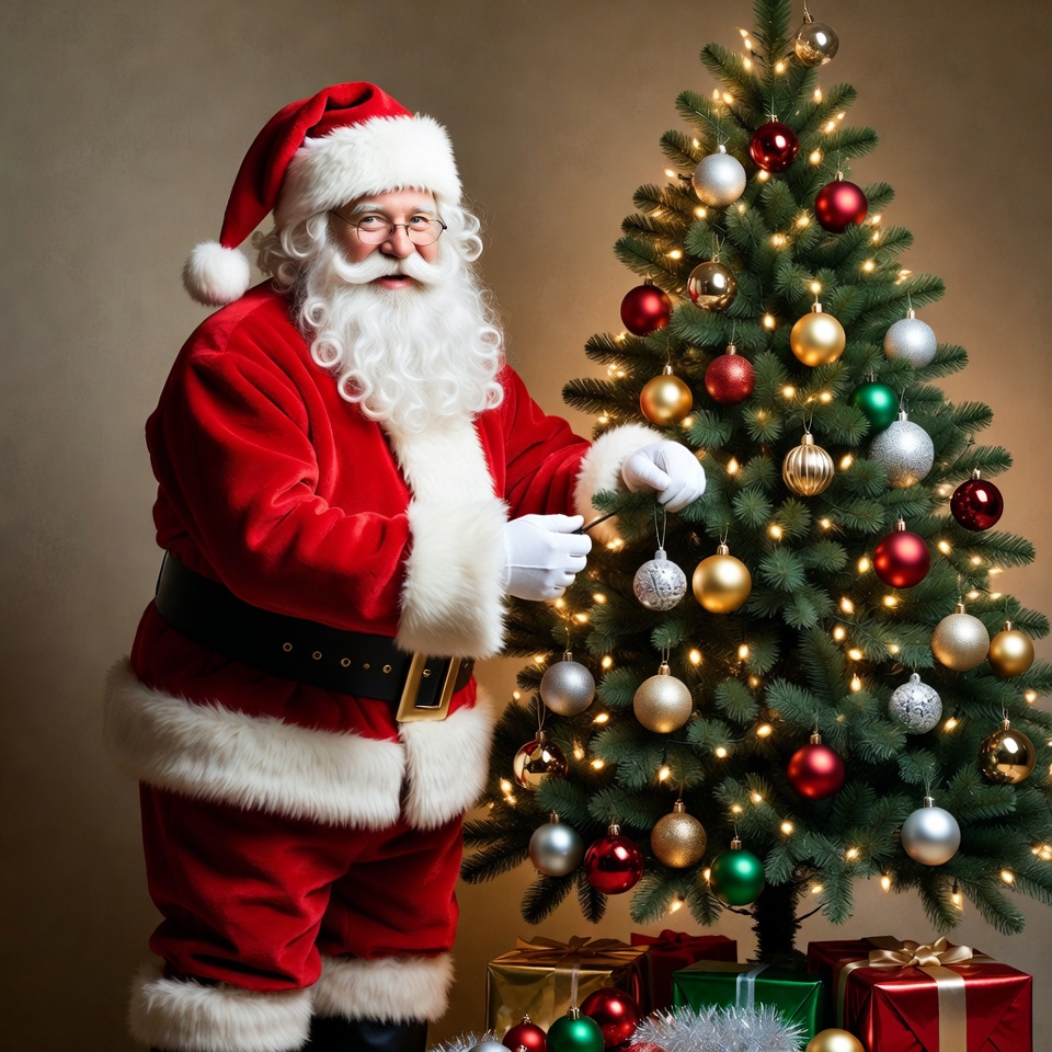 Santa places ornaments on a Christmas tree surrounded by gifts. It captures the joy of holiday preparations in a cozy indoor setting.