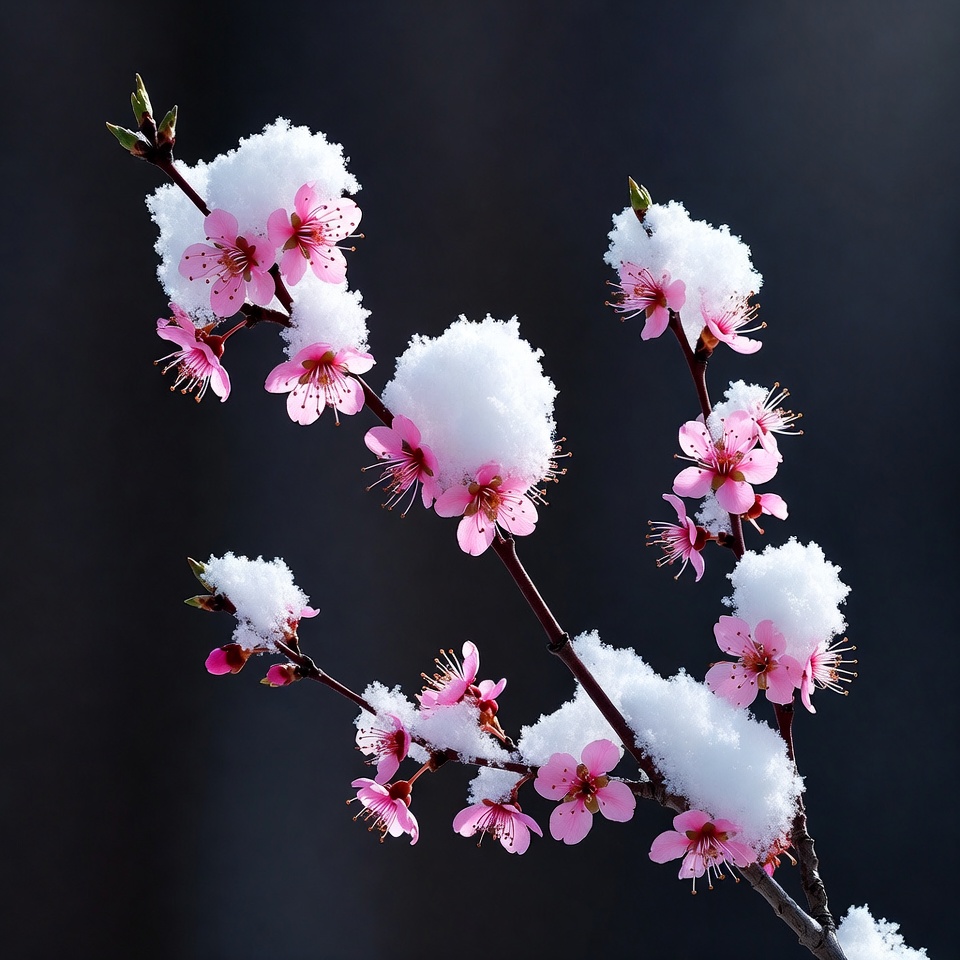 Flowers bloom on a branch while snow piles on top of the petals. This scene shows winter and spring together in one spot.