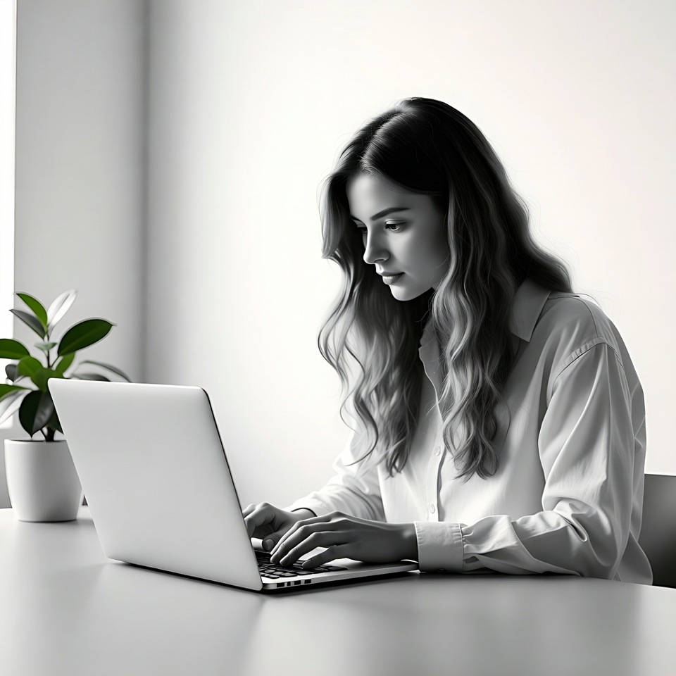 A woman sits at a desk typing on a laptop. A plant is nearby. The setting is simple and bright, suggesting a workspace.