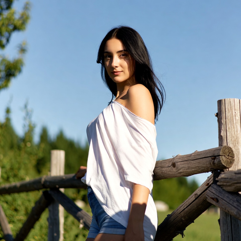 A young woman stands against a wooden fence in a sunny outdoor setting. She wears a white top and denim shorts.