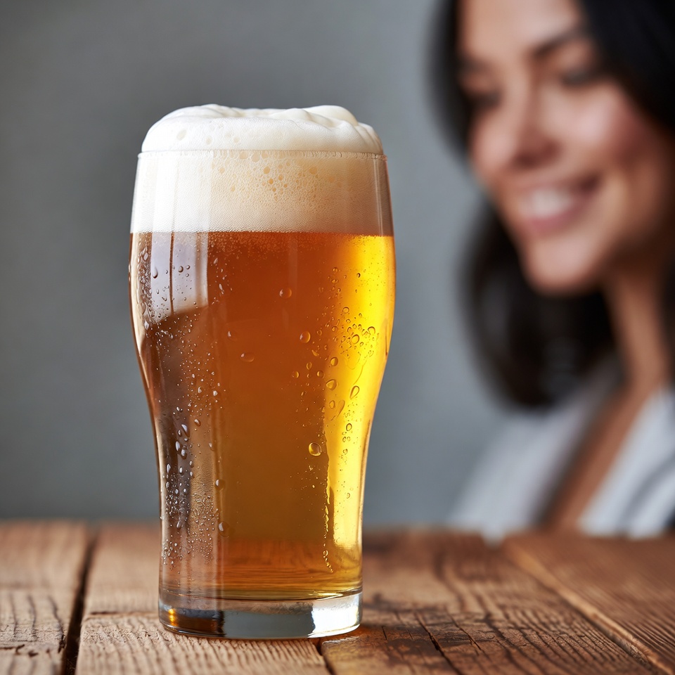 A glass of beer sits on a wooden table. A person smiles in the background, enjoying a moment with friends in a casual setting.