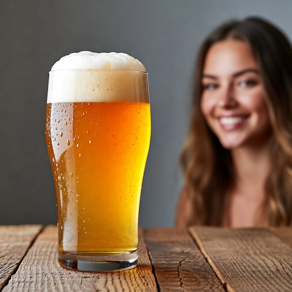 A person smiles while sitting at a table with a glass of beer in front of them. The setting is casual and inviting.