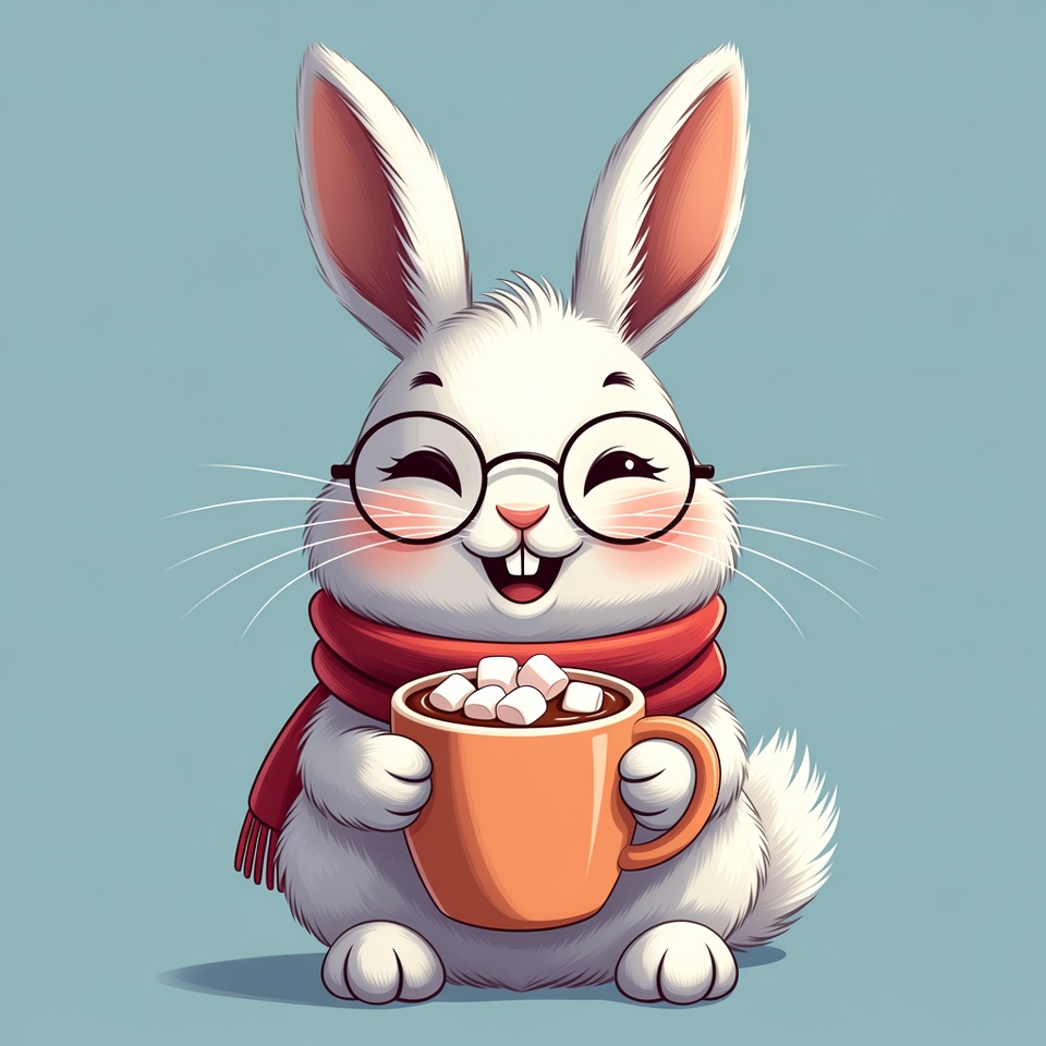 A bunny wearing glasses sits happily, holding a cup of hot chocolate filled with marshmallows while wrapped in a red scarf.