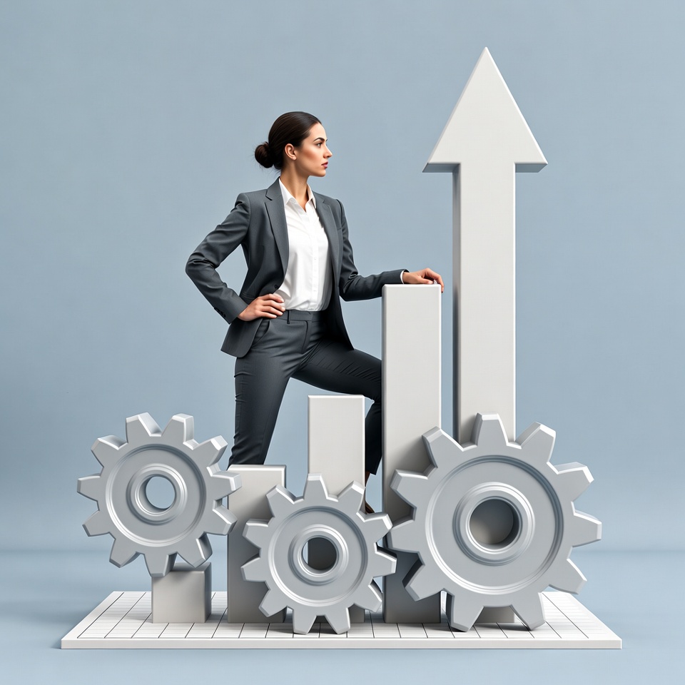 A woman in a suit stands next to bar graphs and gears. She looks confident while modeling success and growth in a business setting.