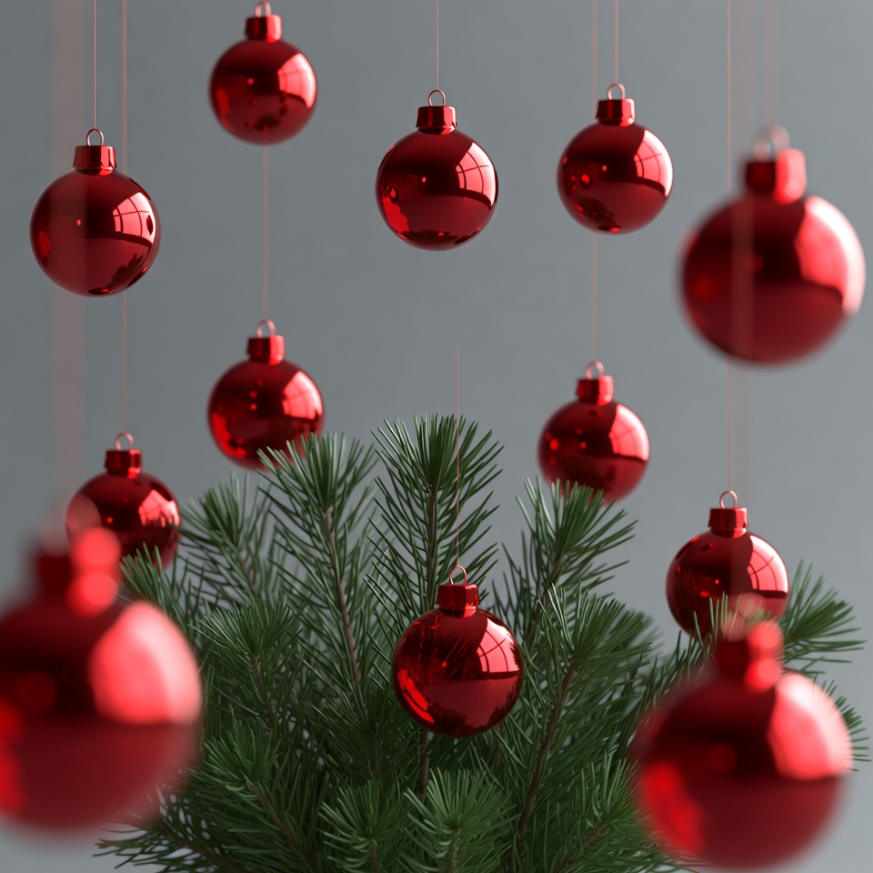 Red ornaments hang above a pine tree. The setting suggests a festive atmosphere. This scene captures the spirit of the holiday season.