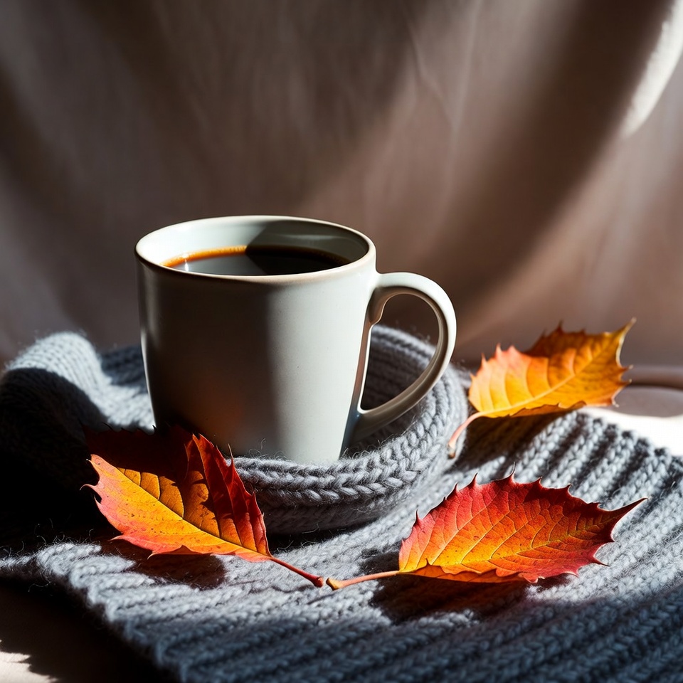 Coffee sits in a white cup on a gray knitted blanket with orange and red leaves nearby in the autumn sunlight.