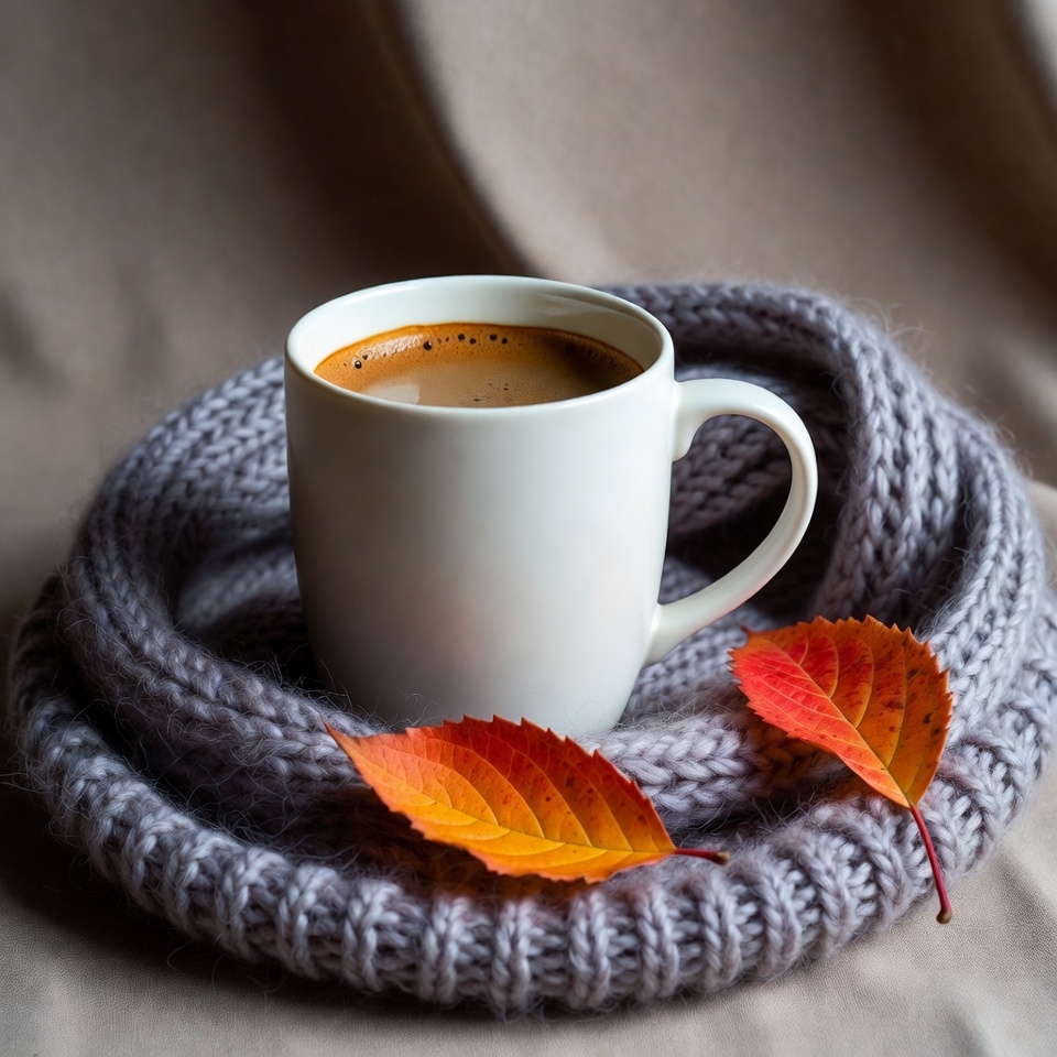 Hot coffee sits on a grey scarf with red leaves around it. The setting suggests a cozy indoor scene during autumn.