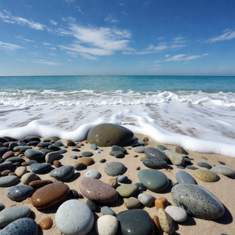 Small pebbles cover the sandy shore as waves roll in from the ocean on a sunny day. The blue sky reflects over the water.