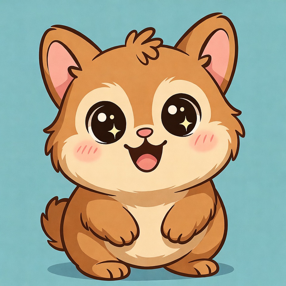 A happy cartoon dog sits with its paws raised. The dog has large expressive eyes and a fluffy tan coat with a white belly.