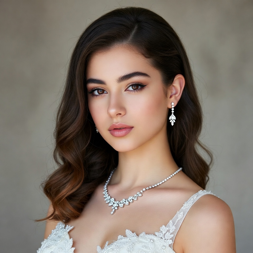 A young woman poses with elegant jewelry and a bridal gown. She stands against a plain background, showcasing her accessories and smooth makeup.