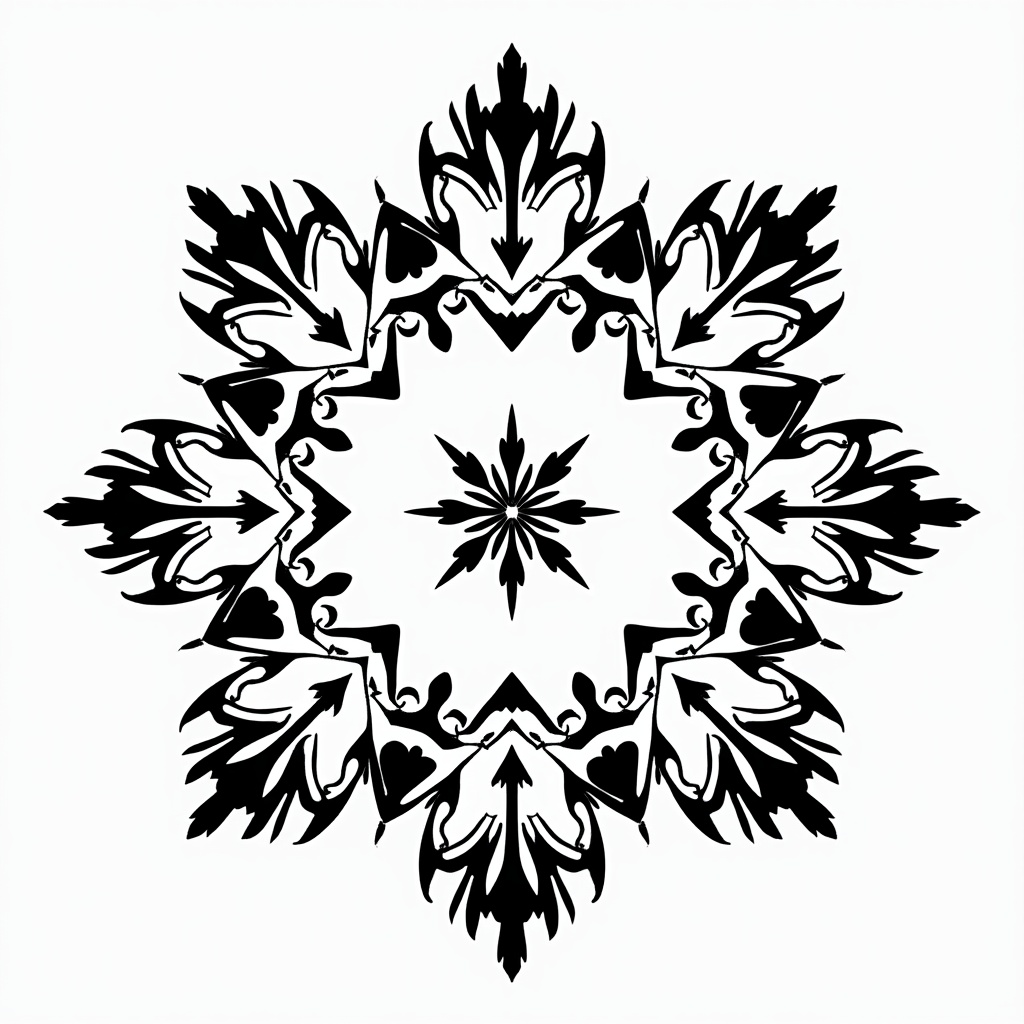 A symmetrical design with sharp edges and smooth curves, featuring a mix of black and white colors. Shapes radiate outward.