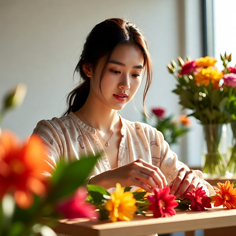 A woman focuses on arranging colorful flowers on a table. Bright sunlight streams through a window, filling the room with light.