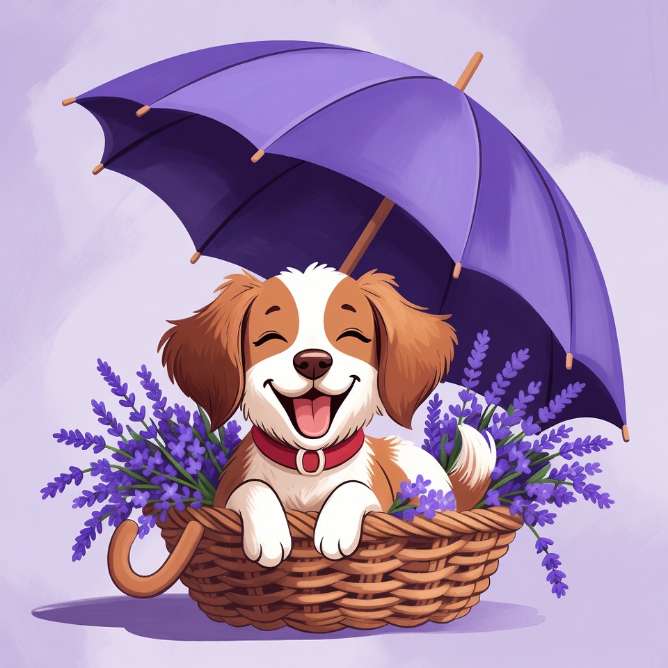 animal, artwork, basket, cartoon, cheerful, companionship, cute, dog, flowers, garden, happy, joy, lavender, nature, outdoor, pet, playful, purple umbrella, smiling, spring