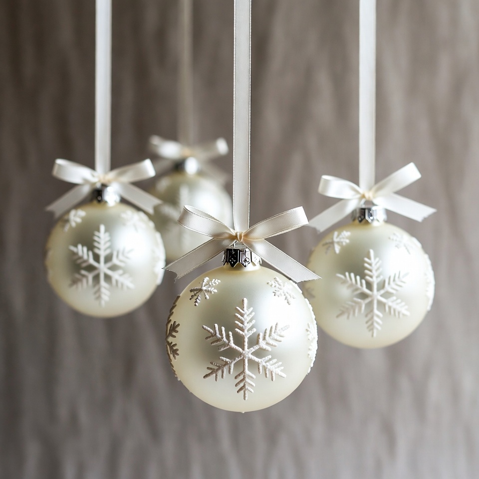 Four white ornaments with snowflake designs hang from ribbons in a home setting. Light reflects off their shiny surfaces.