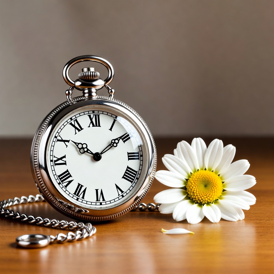 A pocket watch rests on a wooden table next to a white flower with a yellow center. The time is visible on the clock face.