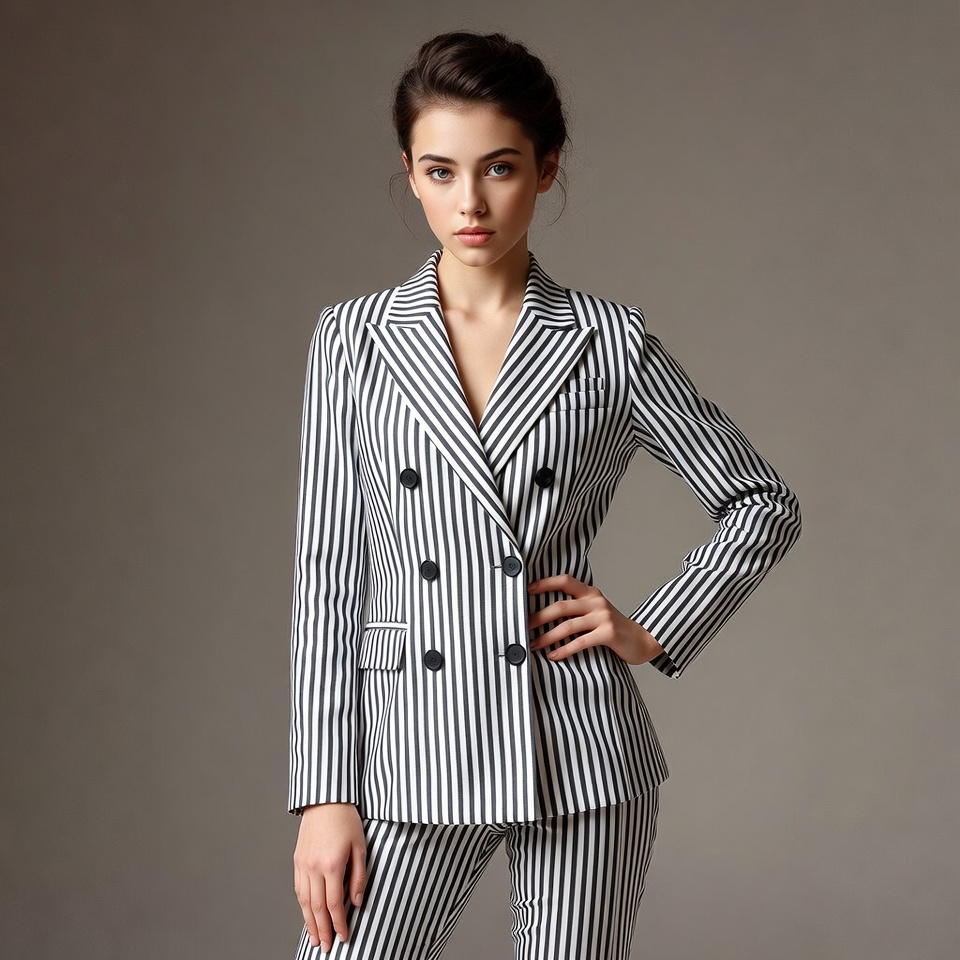 Model poses in a striped suit against a plain background. The setting highlights the outfit and the model's expression.