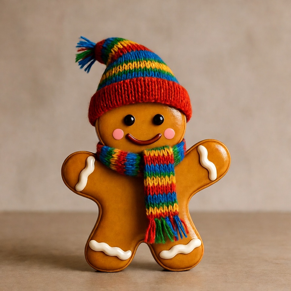 A gingerbread figure wearing a colorful hat and scarf stands against a simple background. The figure has a smiling face and festive decorations.