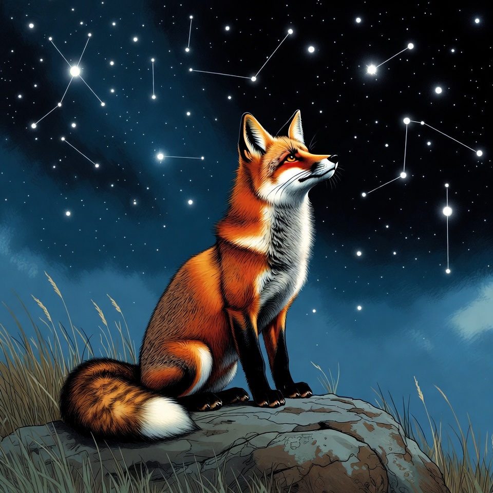 A fox sits on a rock looking up at a starry sky filled with constellations and bright stars. The scene shows tall grass surrounding the rock.