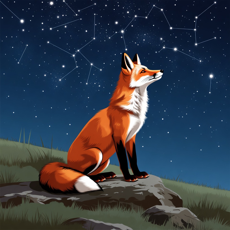 A fox sits on a rock looking up at the night sky filled with stars and constellations. The setting is a grassy area under the darkness.