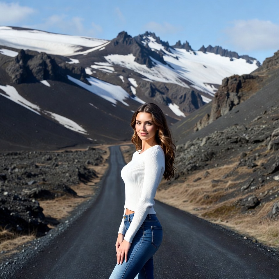 Iceland, adventure, beauty, exploration, jeans, landscape, mountain, nature, outdoor, peaks, posing, road, rocks, scenery, sky, snow, solitude, sweater, travel, woman