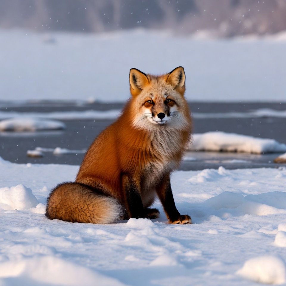 A fox sits on snow near a calm body of water, surrounded by ice and snowflakes, during wintertime in a natural setting.