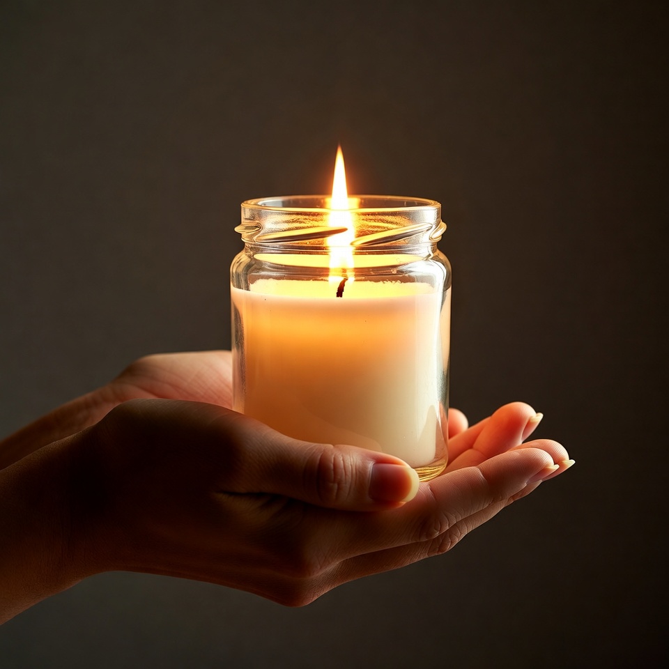 A person holds a lit candle in a jar, showing the flame brightly. The setting is dark, focusing on the warm light of the candle.