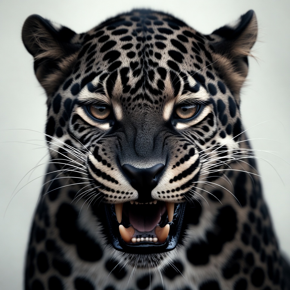 A leopard with its mouth open displays sharp teeth. The animal looks fierce with its intense gaze. It appears ready to defend itself.