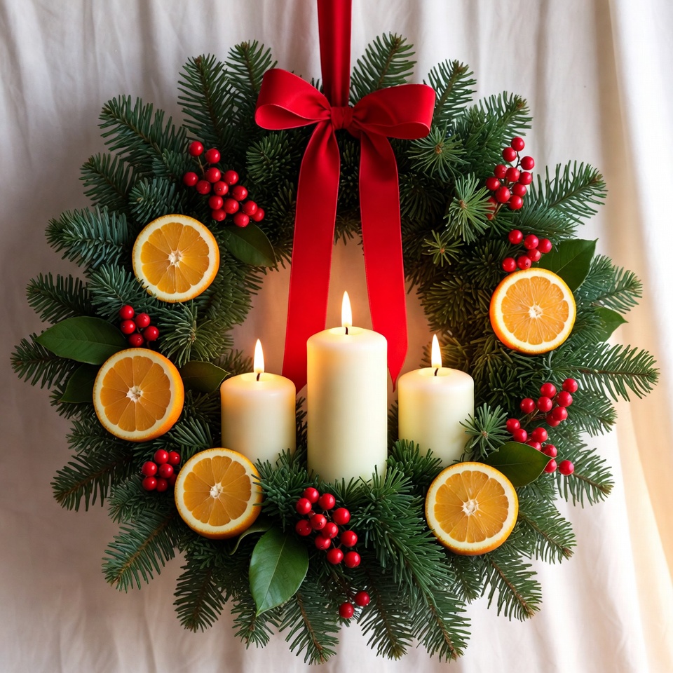 Wreath is made with green foliage, red berries, and orange slices. Three white candles are lit in the center.