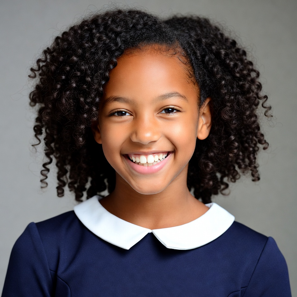 A girl with curly hair smiles brightly while wearing a blue dress with a white collar. She appears happy and cheerful indoors.