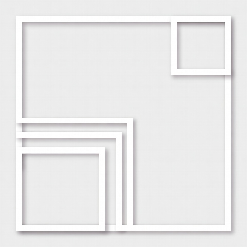 A simple design shows white frames arranged in a geometric pattern on a gray background. The shapes vary in size and position.