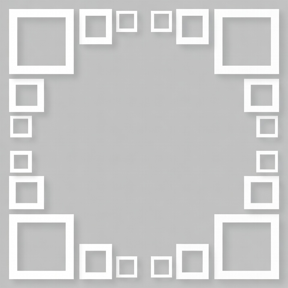 White square frames are arranged in a pattern on a gray background. The frames vary in size and create an interesting display.