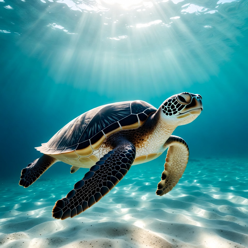 A sea turtle glides through clear blue water. Sunlight filters from the surface, illuminating the underwater scene.