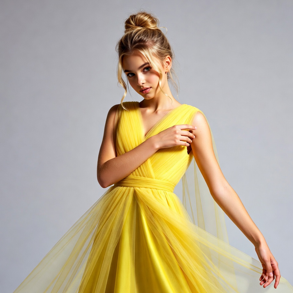 beauty, casual pose, clothing, confidence, dress, elegance, expression, fabric, fashion, hairstyle, model, portrait, posing, studio, studio lighting, style, trend, tulle, woman, yellow