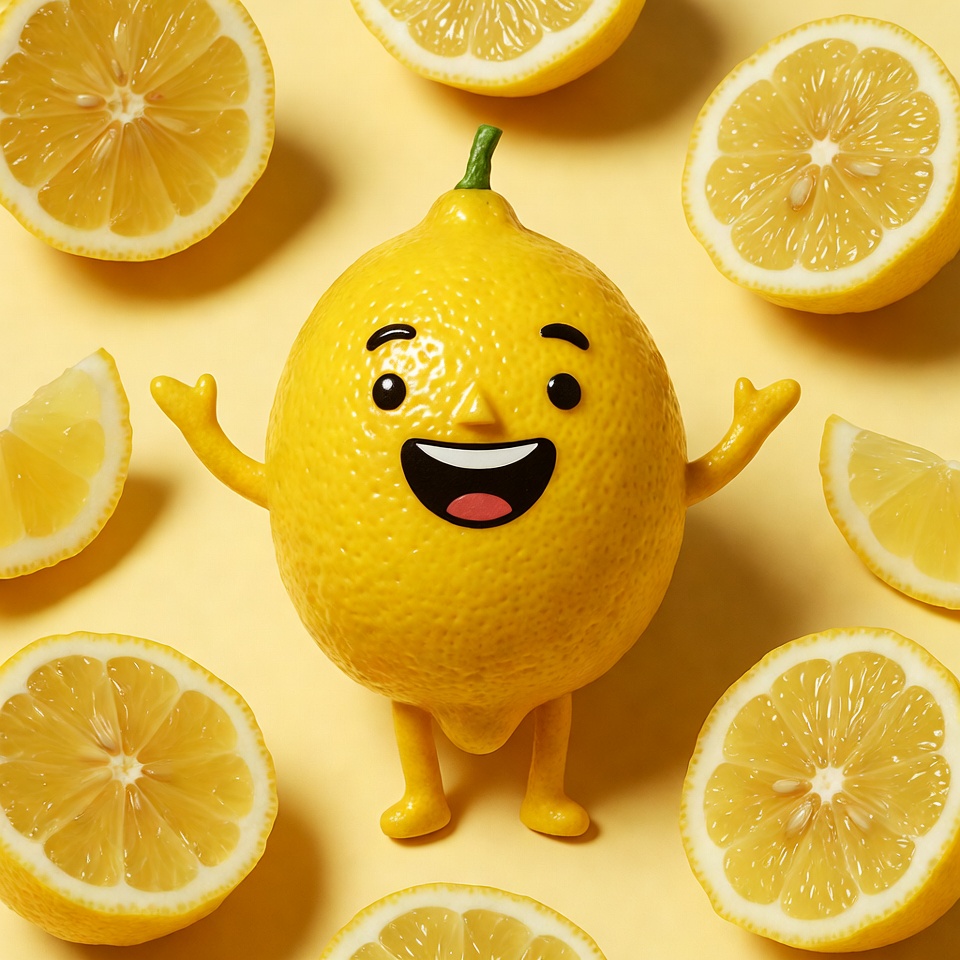 A cute lemon character stands surrounded by lemon slices on a yellow background. It smiles and spreads its arms in a playful manner.