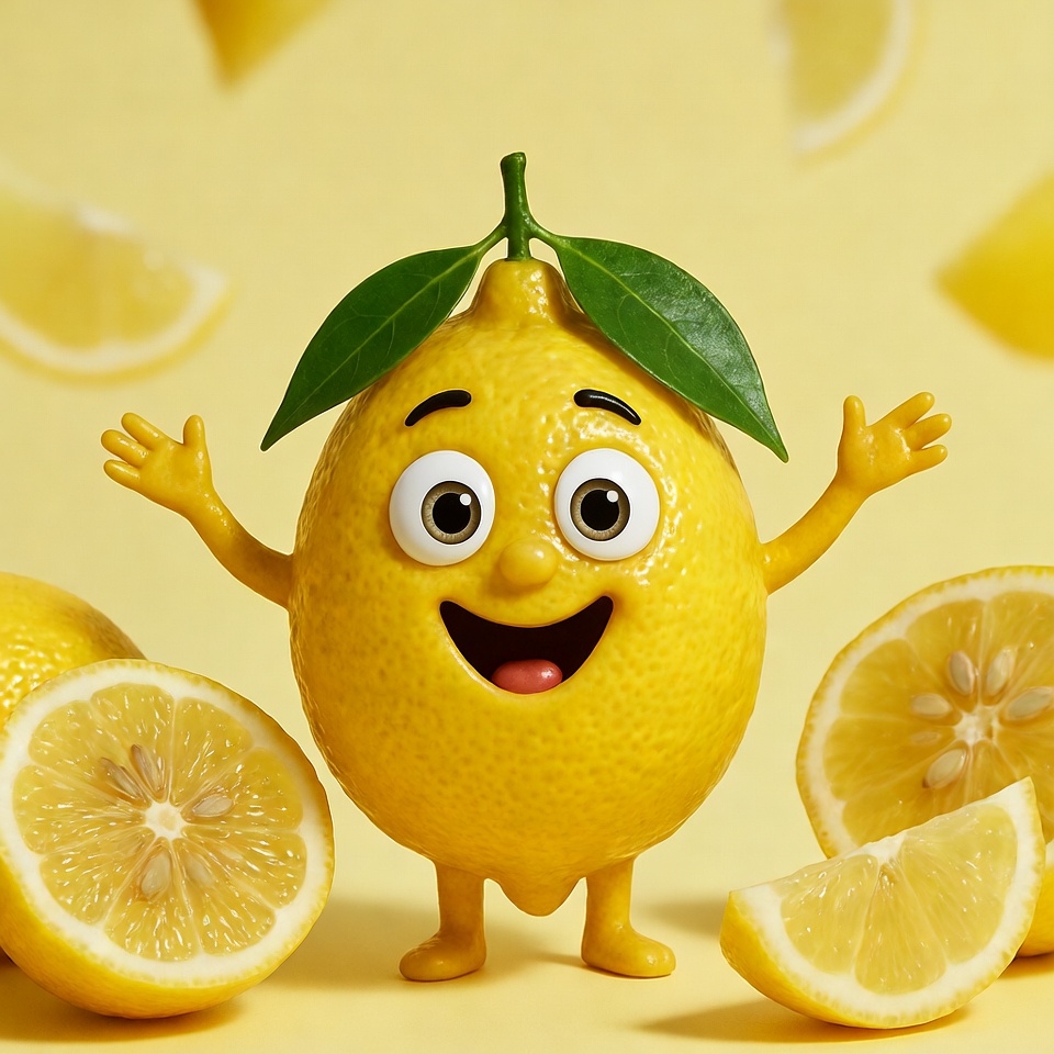 A lemon character with eyes and arms smiles among fresh lemon slices on a bright yellow background. The setting is fun and playful.
