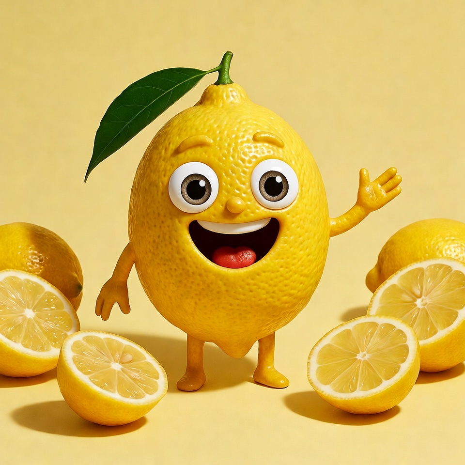 A lemon character stands among sliced lemons on a yellow background. The character waves happily, showcasing its playful nature.
