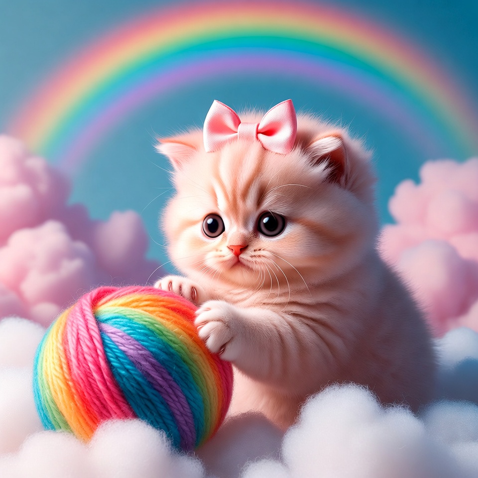 A small cat with a bow is playing with a rainbow yarn ball. The background has clouds and a rainbow. The scene shows fun and joy.