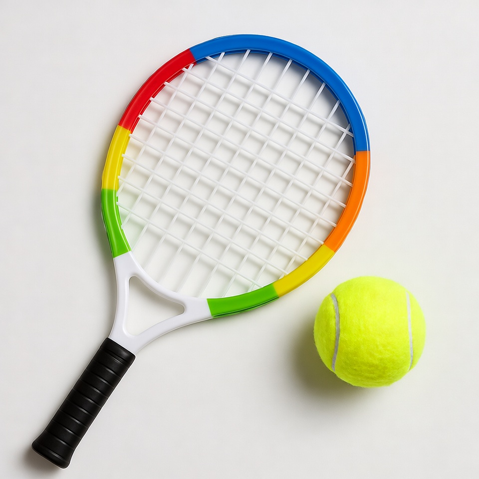 A colorful tennis racket rests next to a bright yellow tennis ball on a white table surface, ready for play or practice.