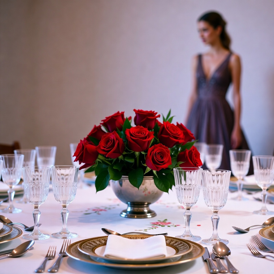 Red roses are arranged in a bowl at a dining table. A woman in a dress stands in the background, ready for the meal.