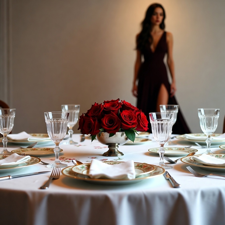 A table is set with plates and glasses. In the background, a woman walks near the table, and roses are placed in the center.