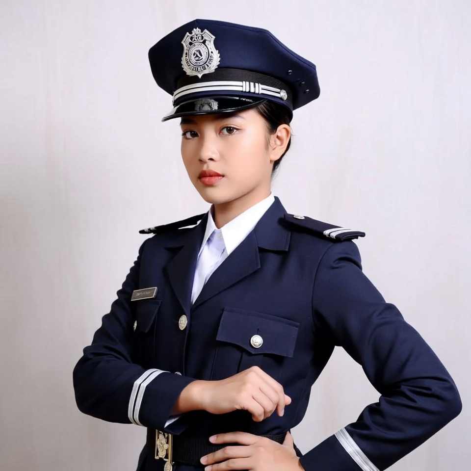 A young police officer stands confidently in uniform. She wears a police cap and appears ready for duty. The setting shows her professional demeanor.