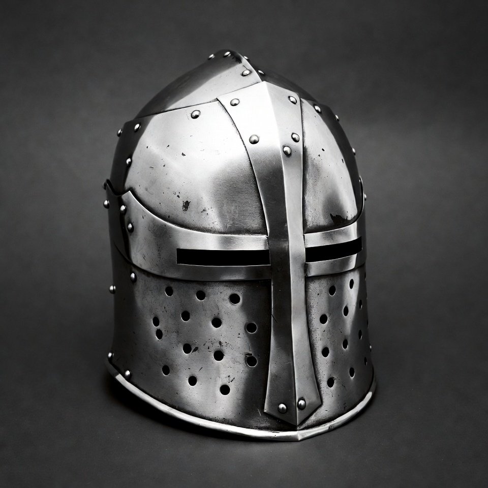 A shiny metal knight helmet rests on a dark surface, highlighting its design and details. The helmet shows various holes and rivets.