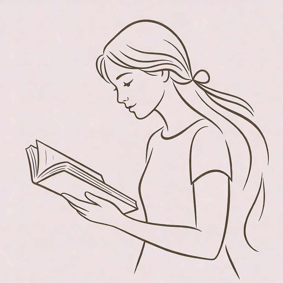 Young woman with long hair reads a book while standing indoors. She shows focus and interest in her reading activity.