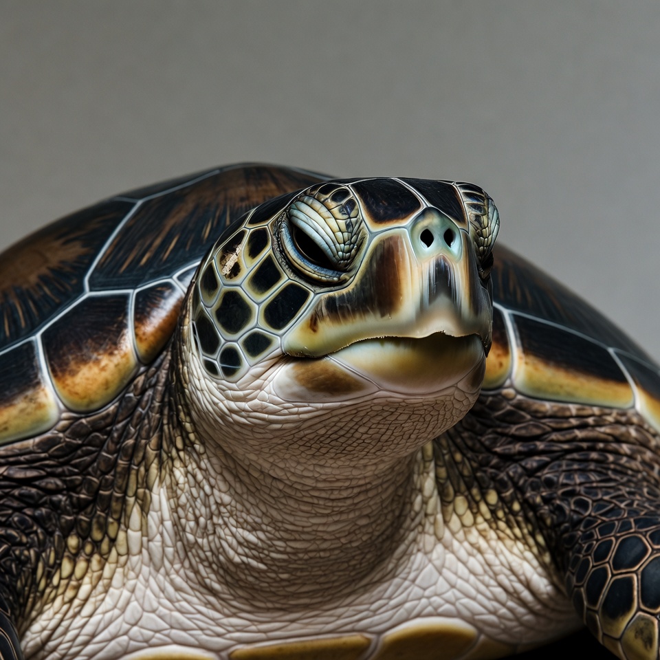 A turtle rests on a flat surface. Its shell displays detailed patterns. The setting highlights the turtle's features and textures.