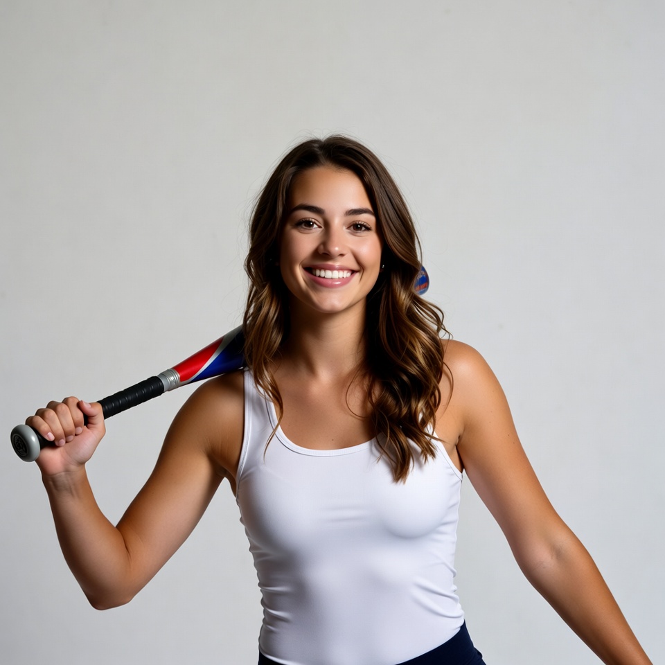A young athlete poses with a baseball bat, smiling at the camera. She stands in a studio with a plain background, showing confidence.