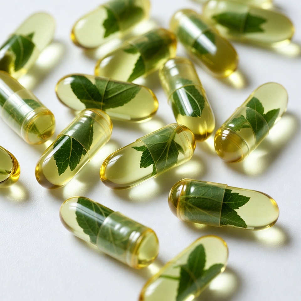 Capsules contain leaves and herbal ingredients placed on a simple surface. The scene shows multiple capsules scattered together.