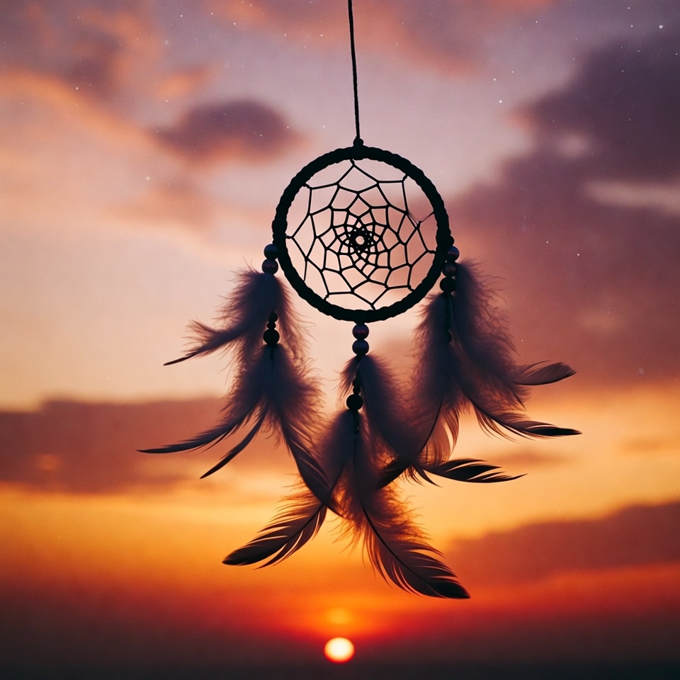 A dream catcher hangs in the air during sunset. The colors of the sky change as the sun sets below the horizon, creating a vibrant scene.