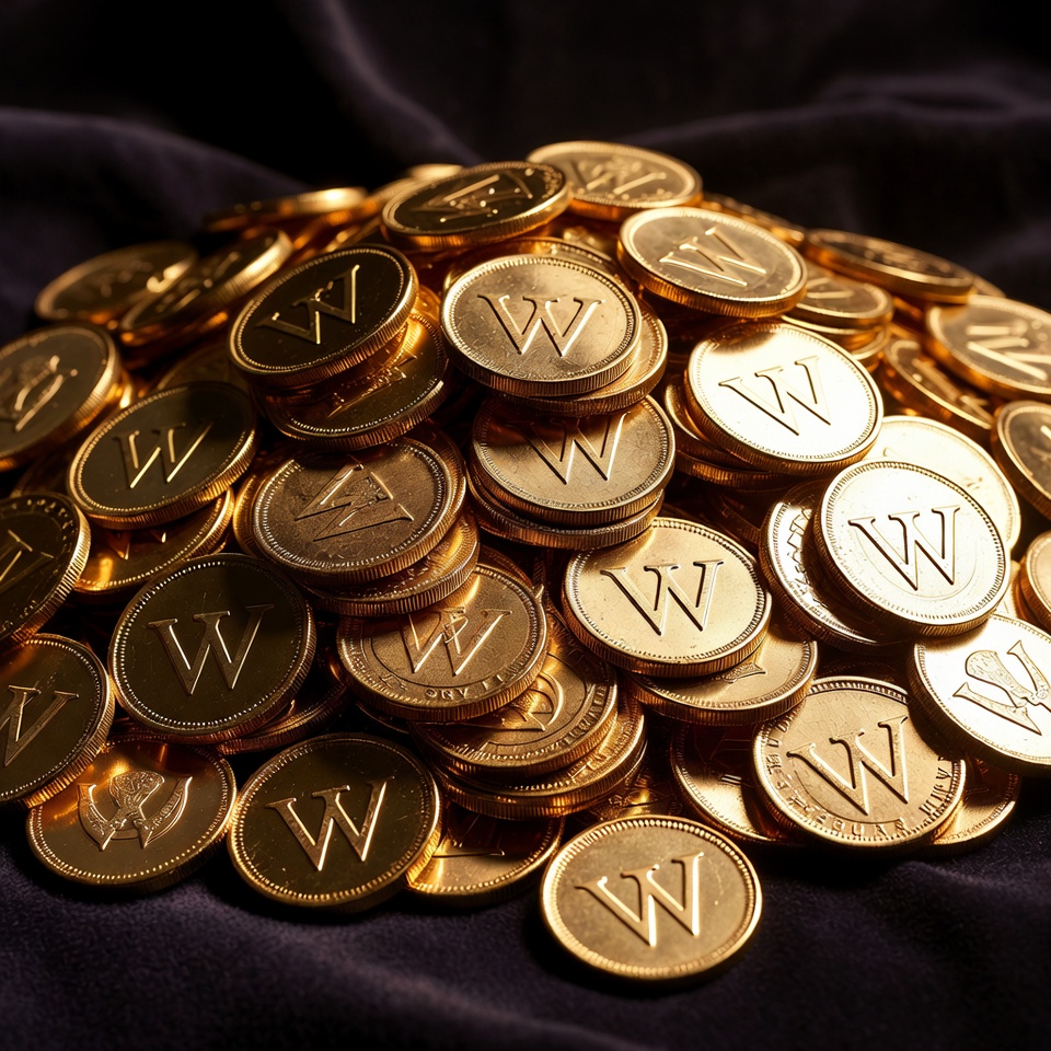 A large pile of shiny gold coins sits on a black velvet surface. The coins have a letter engraved on them and reflect light.